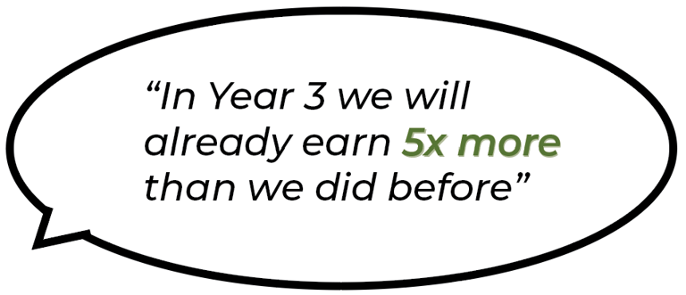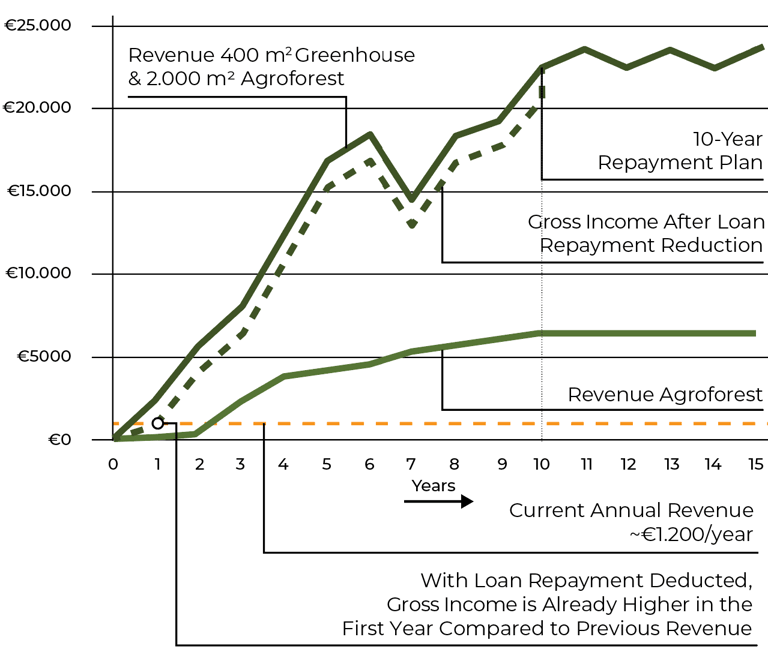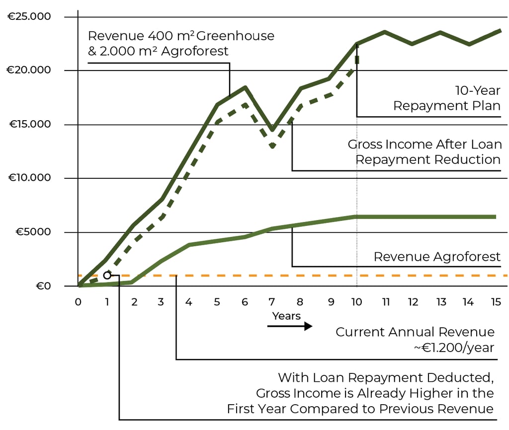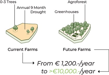 The starting point of our agroforestry design was focused on generating significantly higher incomes for the farmers who will transform their land. On average, smallholder farmers in Senegal earn around €1,200 per year. With our model, the agroforest alone surpasses this income after just three years. Combined with a 400 m² mid-tech greenhouse, smallholder farmers can generate up to €23,800 in annual revenue after 10 years, once the agroforest has reached full maturity and the farmers have mastered greenhouse cultivation techniques.