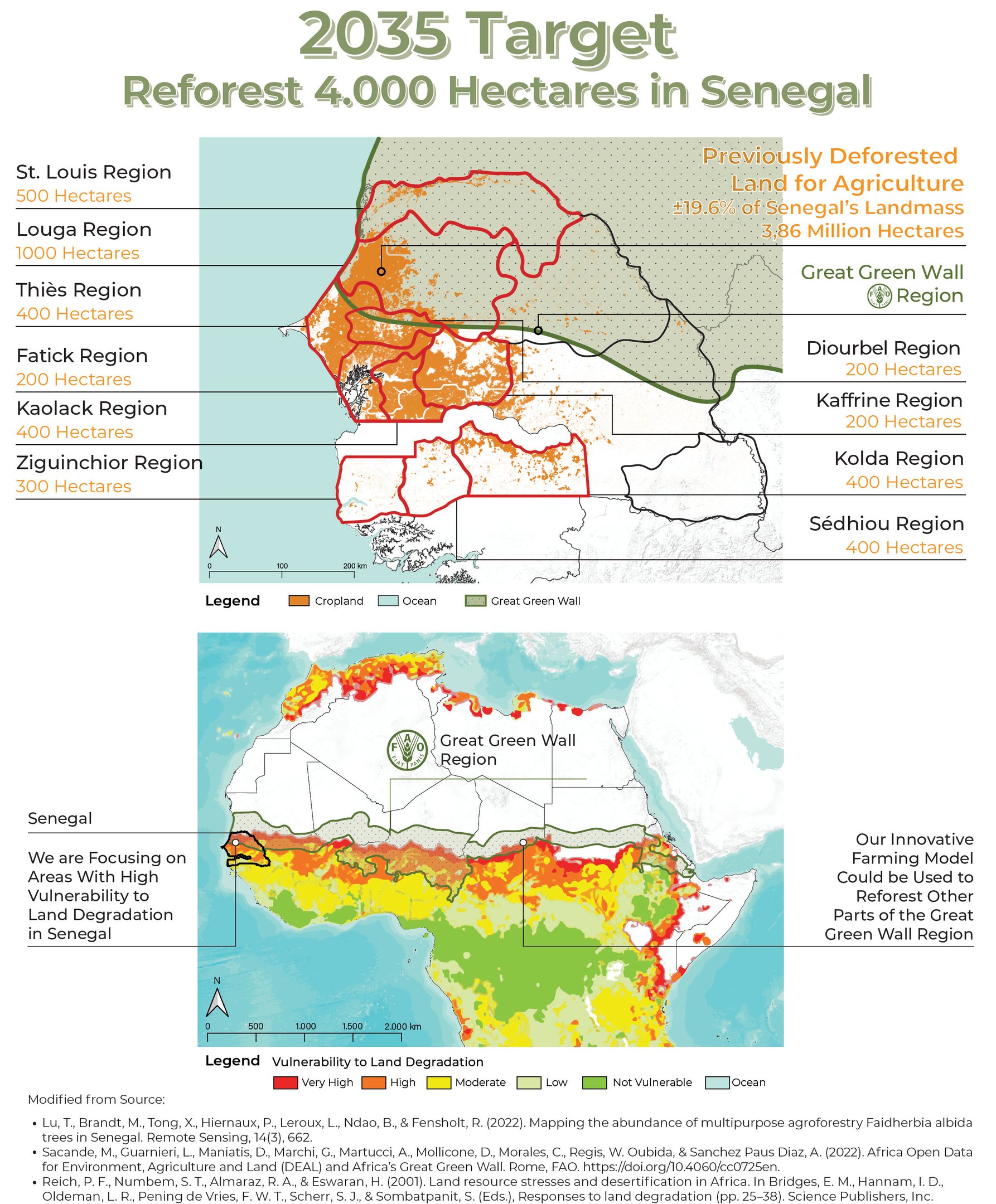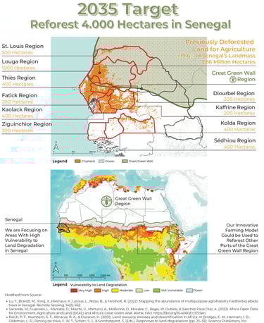 We also include the centrally located regions of Fatick, Kaolack, and Kaffrine in our expansion plan which are also not in the GGW region. In these areas, land is almost entirely used for cropland agriculture, creating higher vulnerability to desertification due to the lack of tree cover. Integrating agroforestry and greenhouse systems here can help restore ecological balance and significantly improve rural livelihoods.